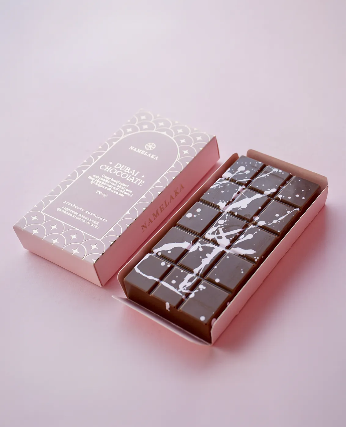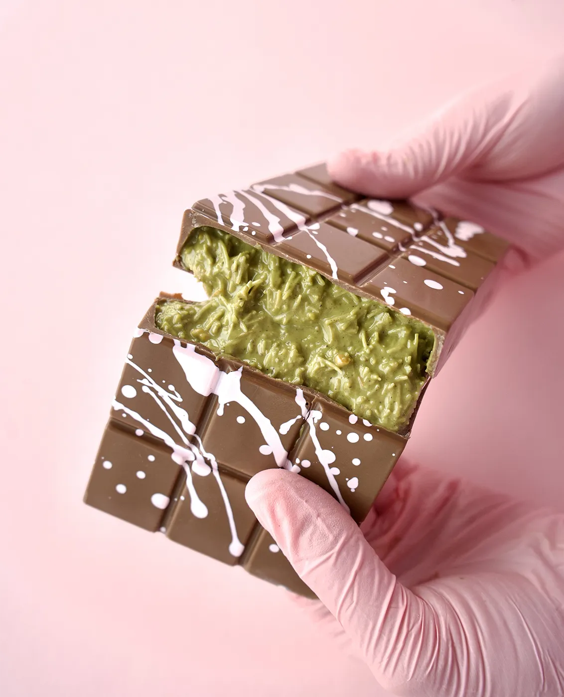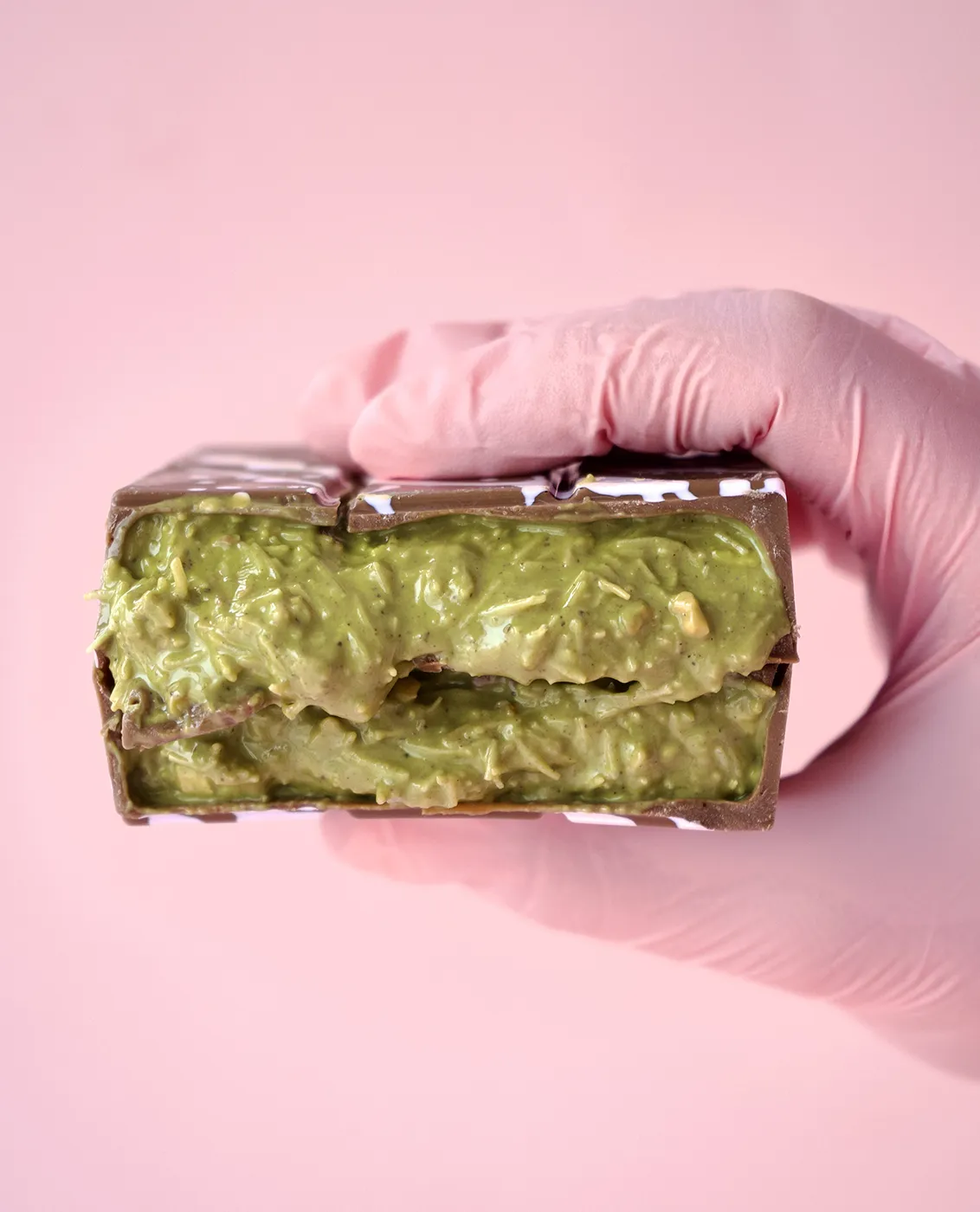 Chocolate that conquered the world. The bar everyone tries to hunt down every day. We experimented for months in the Namelaka lab and invented our own special pistachio formula to make it even tastier than the original! Crispy kataifi pastry, creamy pistachio paste from our secret recipe, tahini paste, and a looot of pistachios — all in an embrace of Belgian milk chocolate. Insanely crunchy and intensely pistachio-creamy!